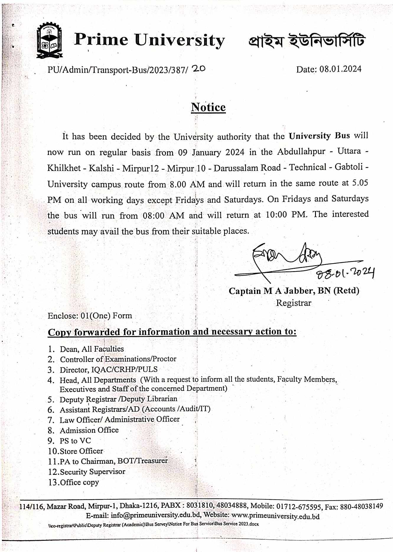 Notice regarding PU Bus Service |